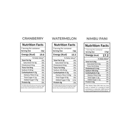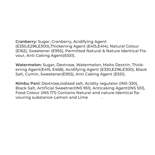 Nimbu Paani Juice – Dextrose, Salt, Acidity Regulator (INS-330), Black Salt, Artificial Sweetener (INS 951), Anticaking Agent (INS 551), Food Color (INS 171), Contains Natural and Nature Identical Flavoring Substance – Lemon & Lime