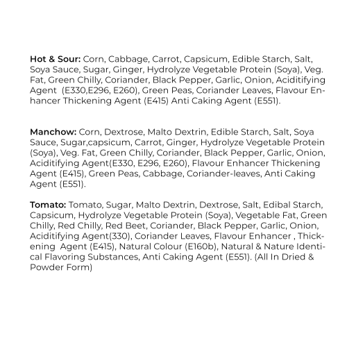 Jowar Puff – Jowar, Edible Oil, Maltodextrin, Dextrose, Milk & Milk Solids, Processed Cheese Powder, Cream Powder, Iodized Salt, Dehydrated Garlic Powder, Dehydrated Green Onion Powder, Dehydrated White Onion Powder, Dried Herbs”