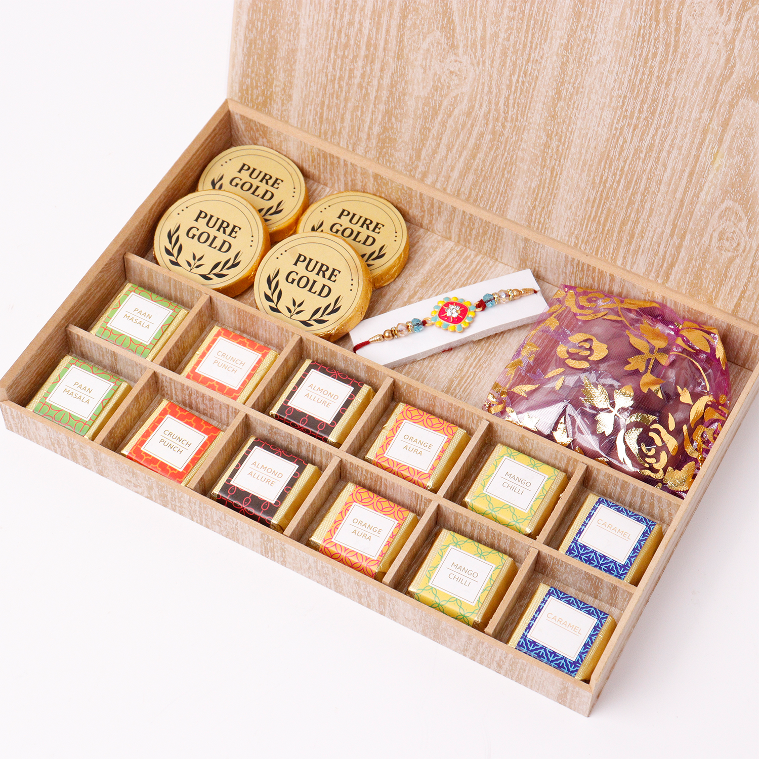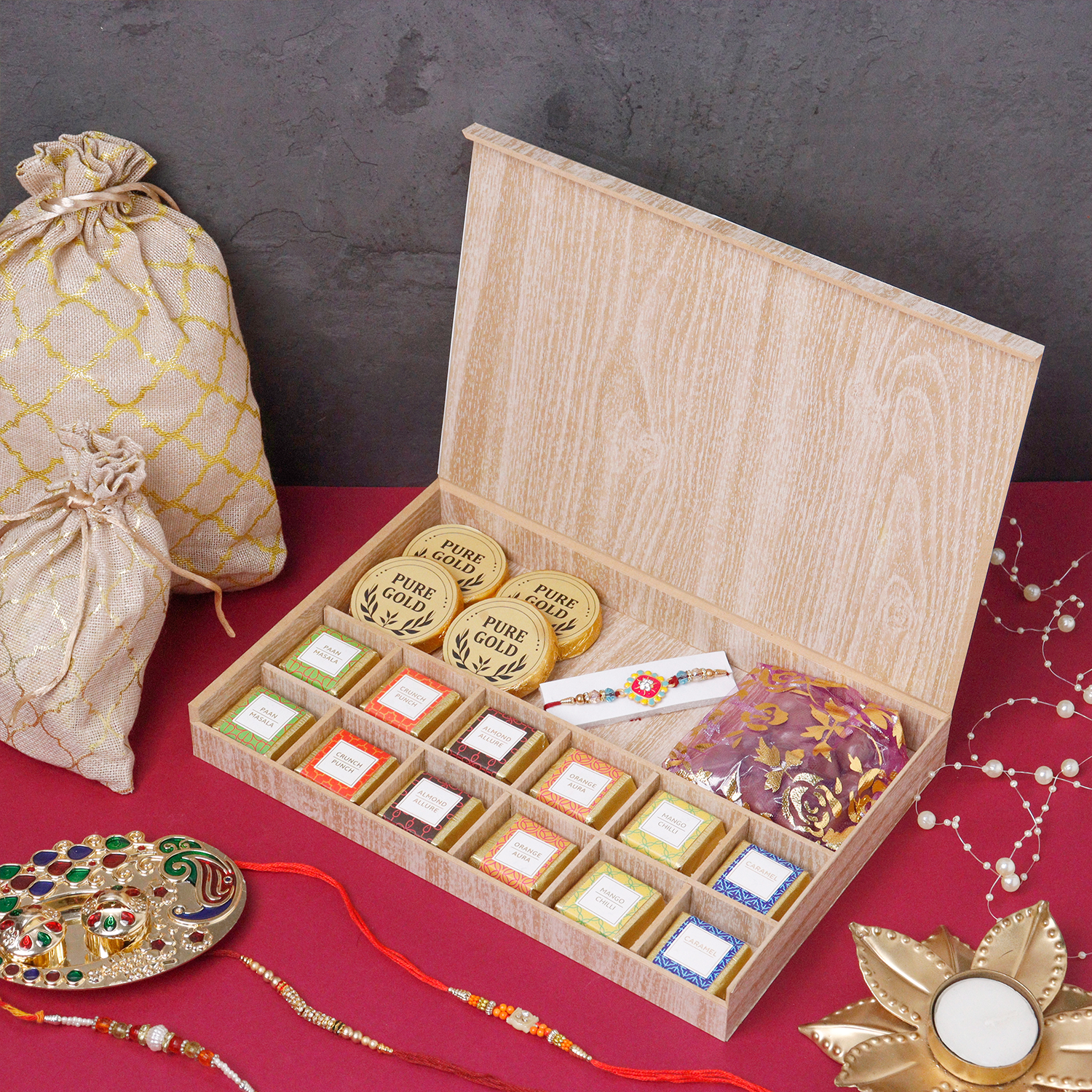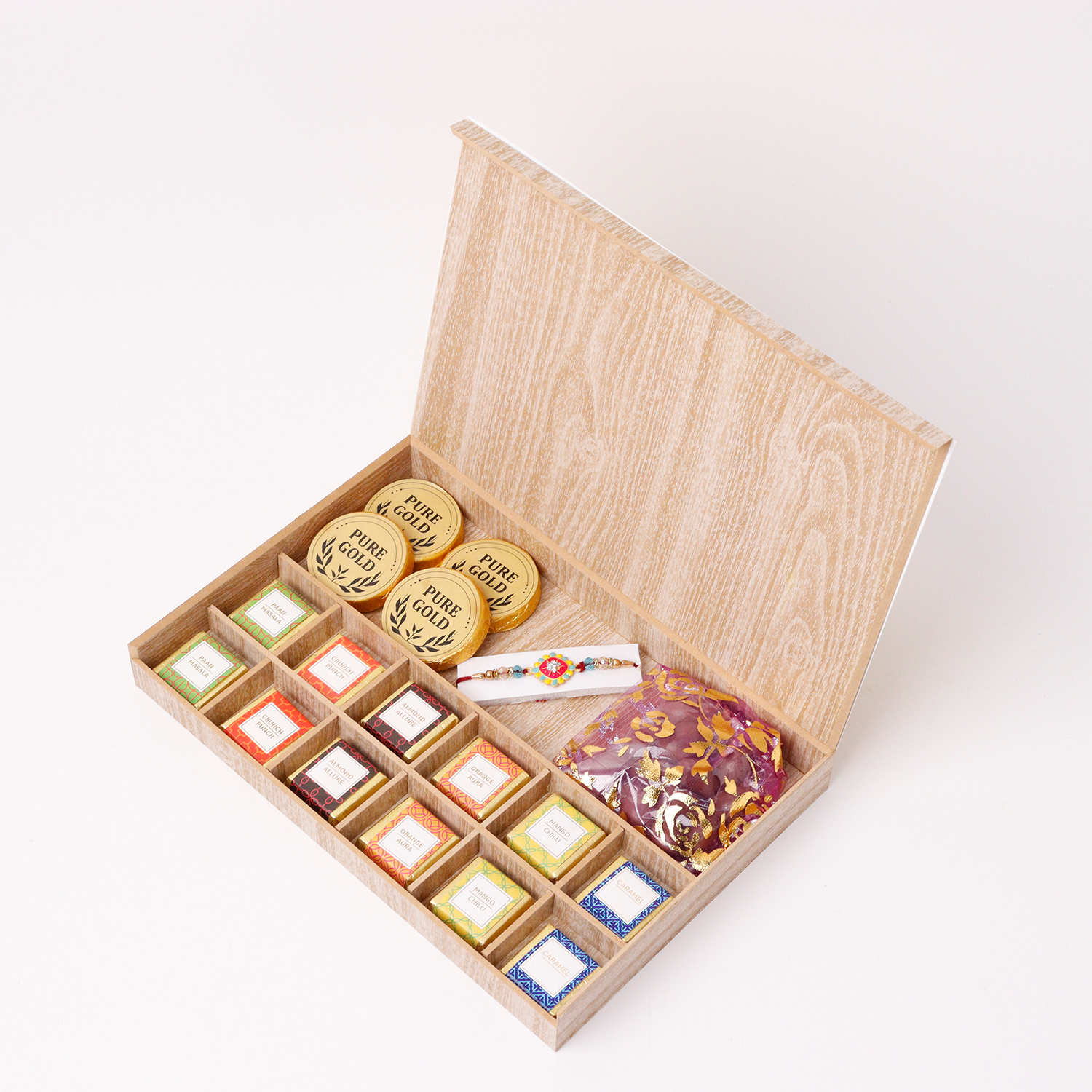 Introducing our Exquisite Premium Rakhi Wooden Hamper – A Celebration of Love and Taste!